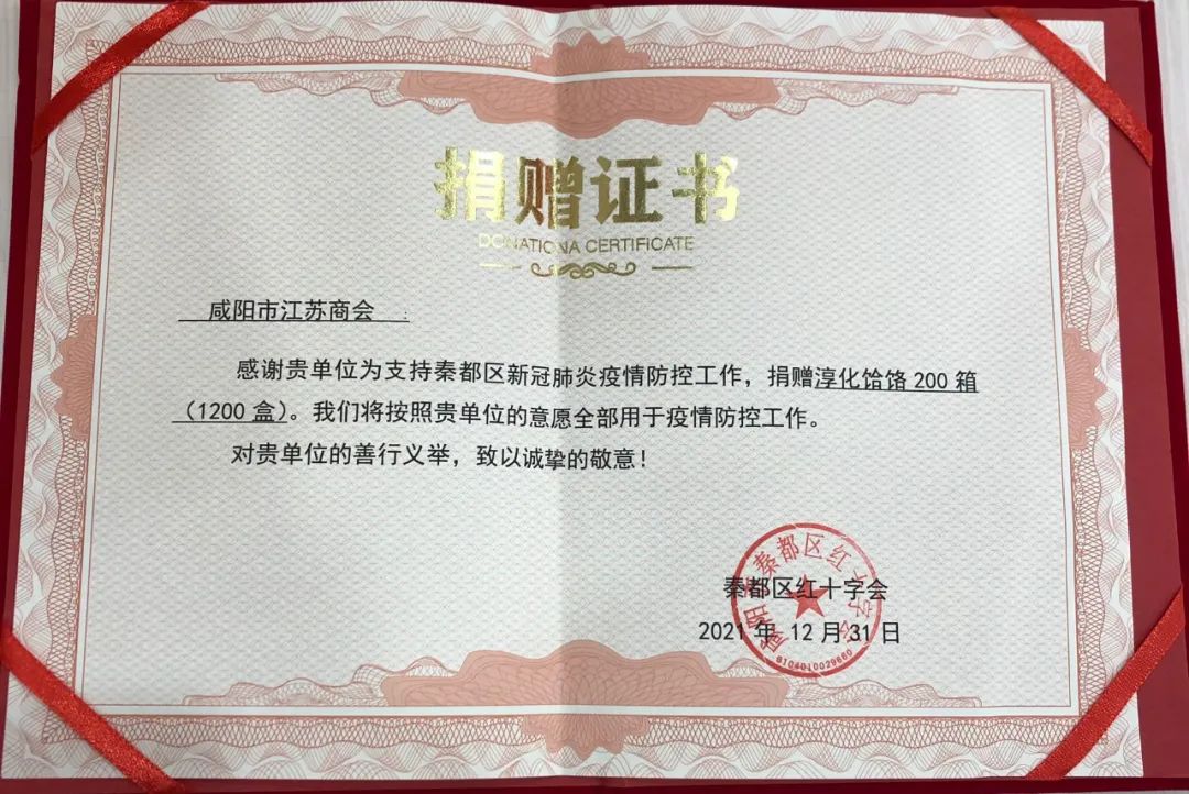 面對新一輪疫情,咸陽市江蘇商會及會員企業(yè)以不同的方式表達對咸陽市一線工作人員的關懷、對咸陽戰(zhàn)“疫”的支持,展現(xiàn)了一幕幕一心共同抗疫情的感人畫面,充分展現(xiàn)了咸陽市江蘇商會助力抗擊疫情的決心和信心,秦都區(qū)紅十字會向咸陽市江蘇商會頒發(fā)捐贈證書。