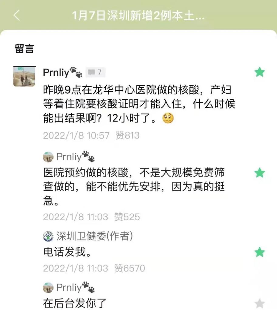 8日上午10時(shí)57分,在“深圳衛(wèi)健委”的微信公眾號(hào)推文下,一位叫“Prnliy”的網(wǎng)友留言,引起深圳市衛(wèi)健委工作人員的關(guān)注。這位網(wǎng)友說:“昨晚9點(diǎn)在龍華中心醫(yī)院做的核酸,產(chǎn)婦等著住院要核酸證明才能入住,什么時(shí)候能出結(jié)果?。?2個(gè)小時(shí)了。”