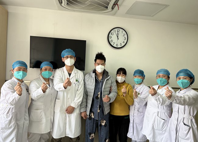 小張與醫(yī)護人員合影。陜西省第二人民醫(yī)院供圖