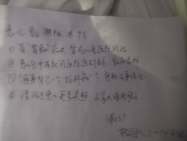 陽陽(化名)的交接單。西安醫(yī)學(xué)院第二附屬醫(yī)院供圖