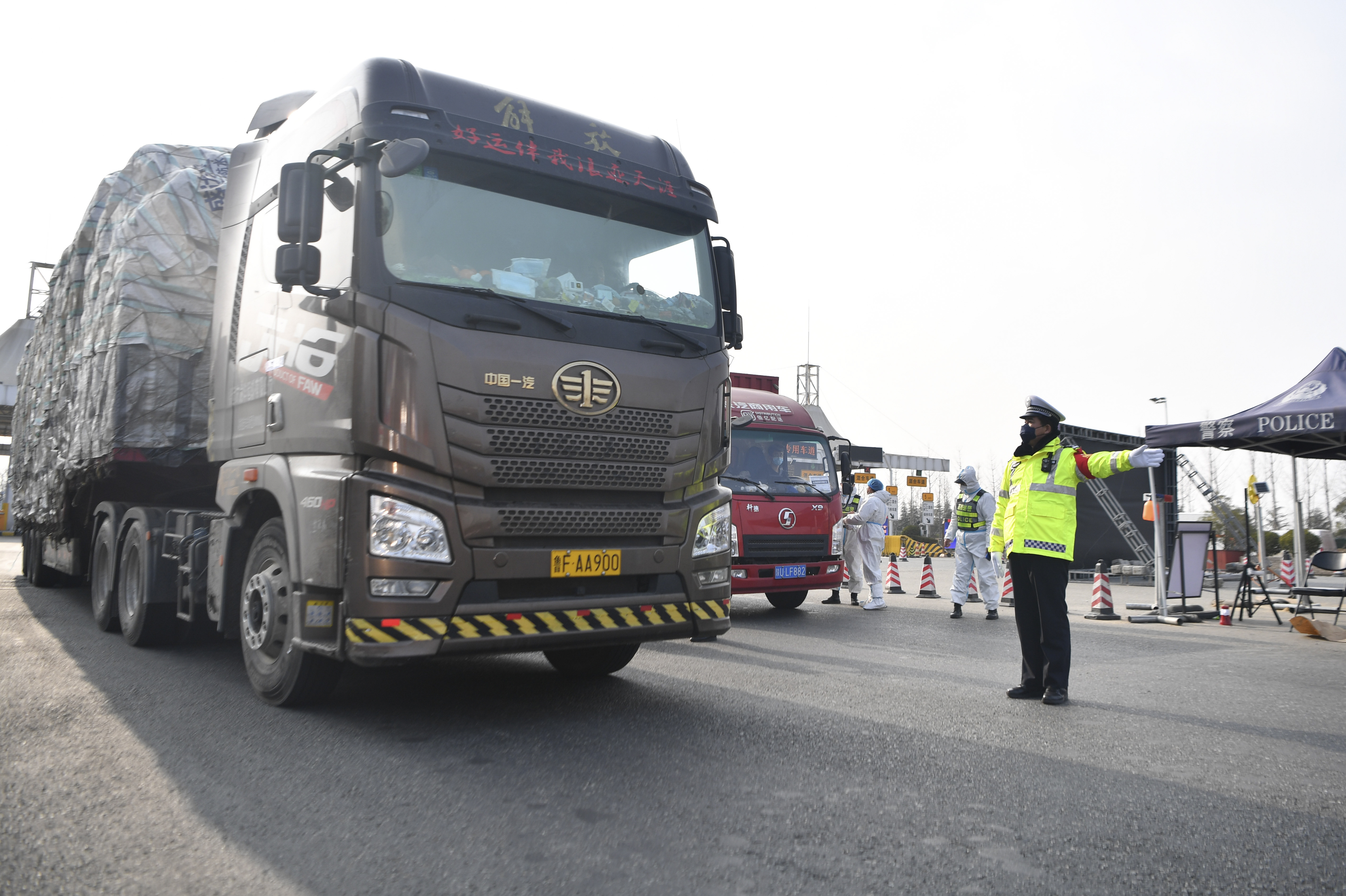 1月10日,西安市公安局浐灞生態(tài)區(qū)分局民警在西安市繞城高速新筑收費(fèi)站查驗(yàn)車輛通行證件。新華社記者 張博文 攝