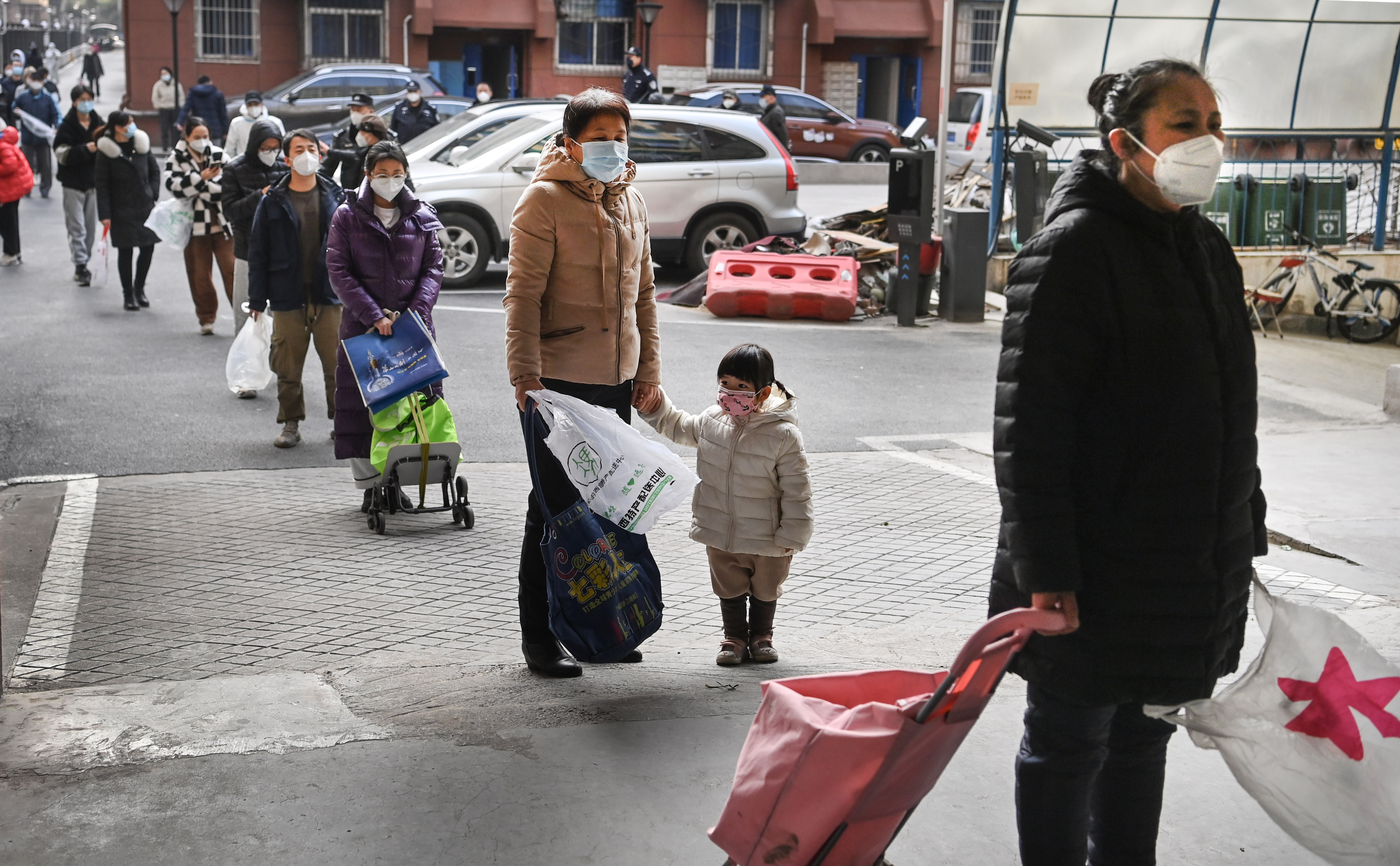 1月10日,雁塔區(qū)科技路一小區(qū)的居民排隊(duì)領(lǐng)取愛心人士捐贈的生活物資。新華社記者 陶明 攝