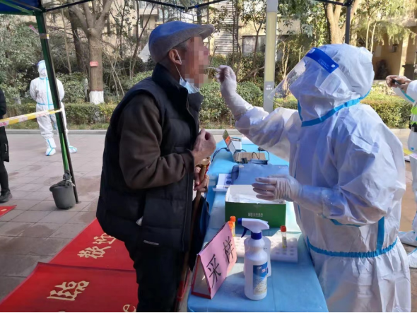 經(jīng)過星夜兼程,連夜入住酒店,開展各種培訓(xùn)、考核,為釆樣工作積極準(zhǔn)備著。12月19日,寶雞采樣隊(duì)接到的任務(wù)是支援浐灞金融園區(qū)全員的核酸釆樣工作。金融園區(qū)有將近9萬人 ,由于人口眾多,核酸釆集工作量大,時(shí)間要求緊迫,為了在規(guī)定時(shí)間內(nèi)完成釆樣任務(wù),寶雞采樣隊(duì)的隊(duì)員早出晚歸,每天休息時(shí)間很短暫,實(shí)在太累,常常在吃飯時(shí)打個(gè)盹。冬日的西安,寒風(fēng)凜冽,殘雪未消,嚴(yán)峻的疫情形勢,絲毫沒有嚇倒可愛的隊(duì)員們,反而更加喚起大家的熱血斗志。西安的夜晚很冷,零下6-7℃更是常態(tài),隊(duì)員們從不怕冷,更不叫苦,依然堅(jiān)守在凌冽的寒風(fēng)中,在崗位上一干就是數(shù)個(gè)小時(shí),任務(wù)集中的時(shí)候,大家顧不上吃飯 ,穿著厚重的防護(hù)服 ,全副武裝 ,連呼吸都很困難。數(shù)個(gè)小時(shí)的連續(xù)做戰(zhàn),每個(gè)人都腰酸背痛,防護(hù)面屏上更是結(jié)起了一層薄冰 ,隊(duì)員們的手指被凍得腫脹通紅,冰冷的消毒水一遍遍刺激著隊(duì)員們的末梢神經(jīng),但這絲毫沒有影響他們工作的熱情 ,沒有一個(gè)人退縮,太冷了他們就在原地跺跺腳,大家相互加油打氣,只為凌晨的堅(jiān)守和不忘初心的使命!隊(duì)員們耐心地囑咐大家張開嘴巴,發(fā)出“啊”的聲音 ,一個(gè),兩個(gè),三個(gè)……這樣的動作,重復(fù)了一遍又一遍。碰到年齡較小的幼童,核酸采樣人員更是顧不得地面冰涼,單膝跪地完成采樣。