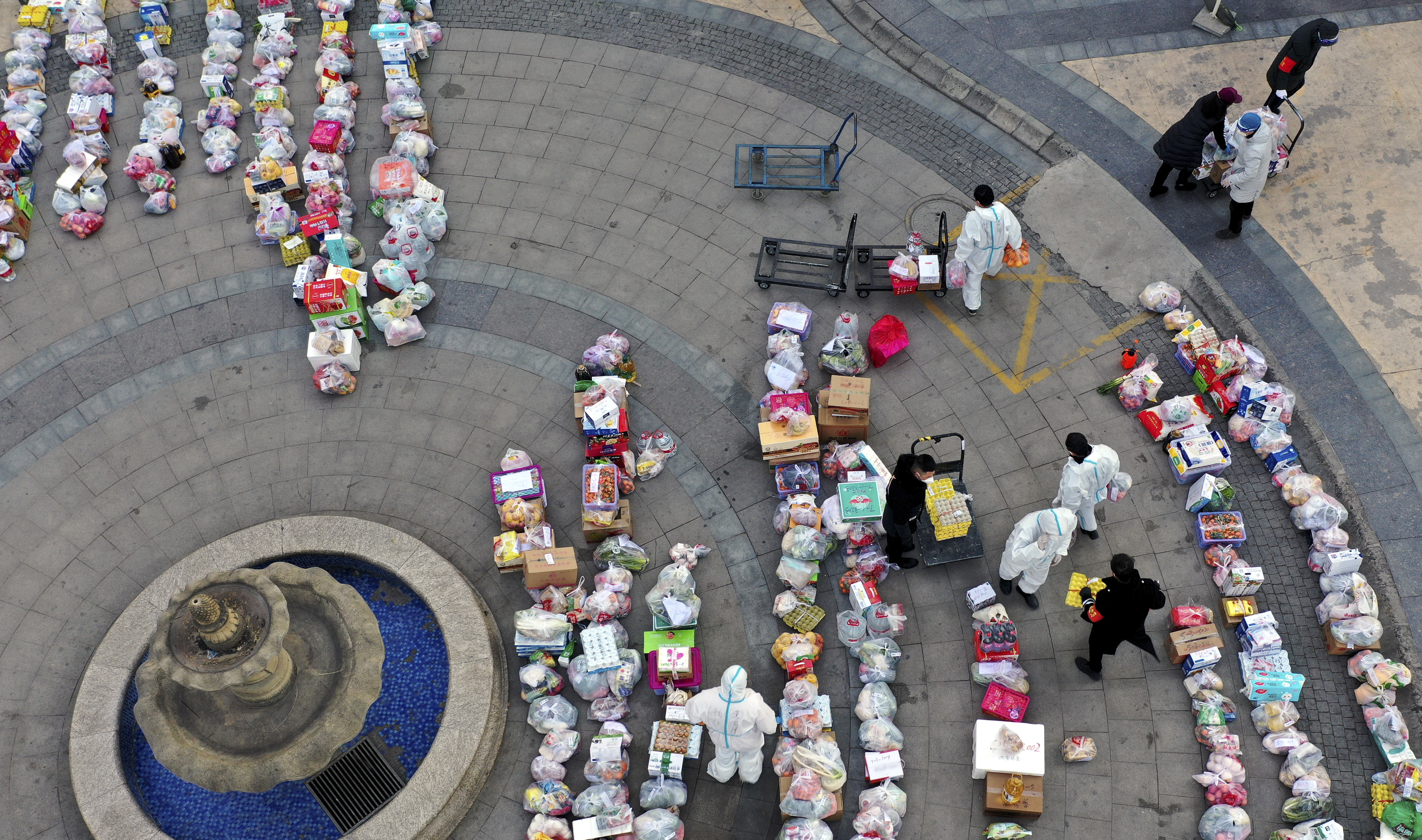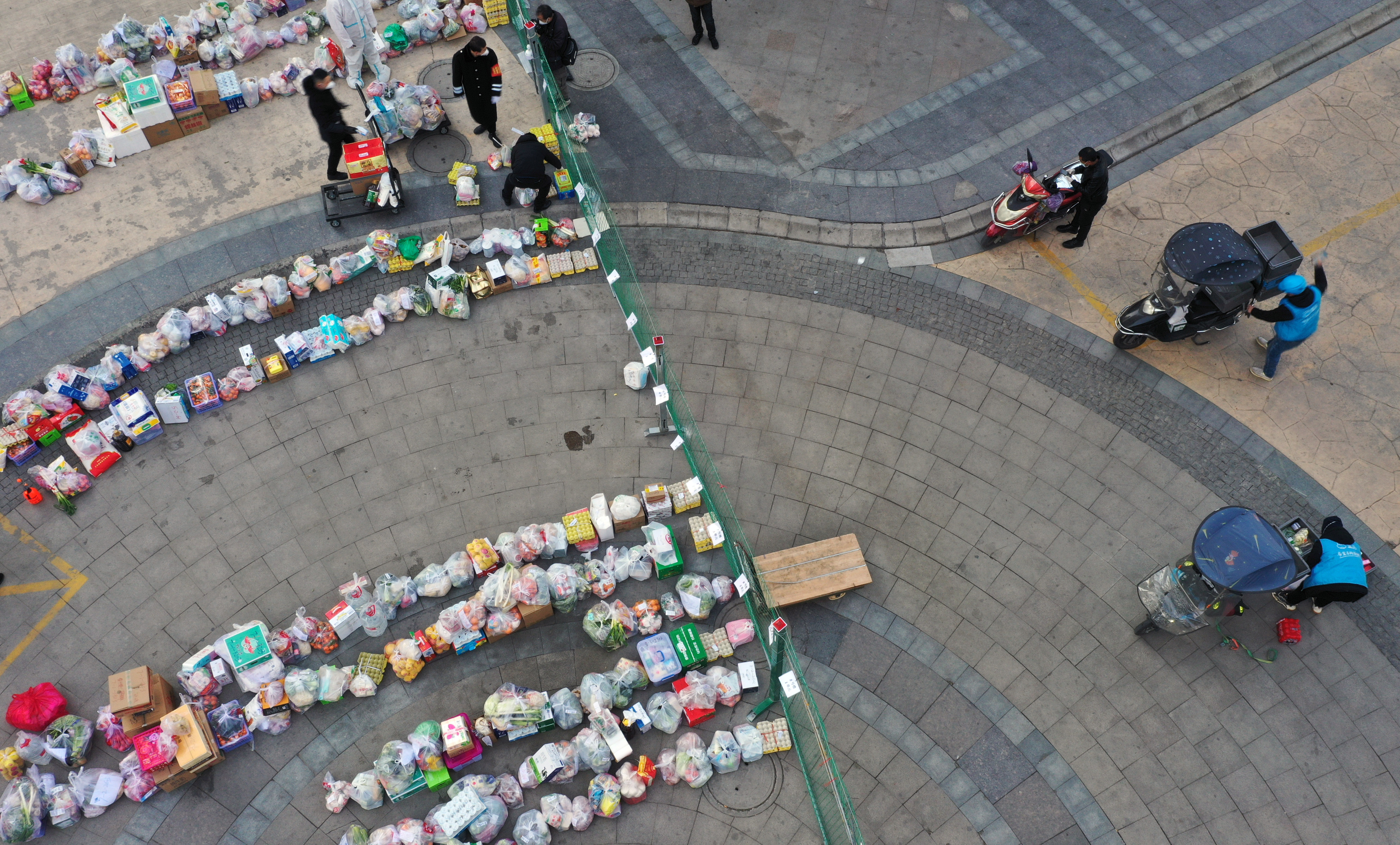 1月12日,下沉干部和志愿者在社區(qū)門前小廣場接收居民線上購買的生活物資(無人機照片)。