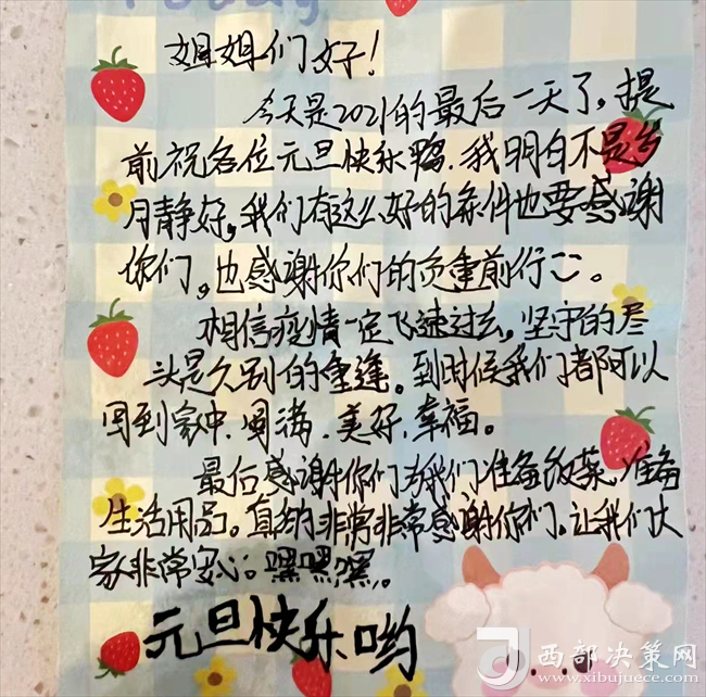12月31日晚,即將迎來我國(guó)傳統(tǒng)佳節(jié)元旦。隔離學(xué)生怡忻悅通過手機(jī)向田甜發(fā)來了一張留言卡片,“姐姐好!今天是2021年的最后一天了,提前祝大家元旦快樂。我明白不是歲月靜好,我們有這么好的條件要感謝你們,感謝你們的負(fù)重前行。相信疫情一定飛速過去,堅(jiān)守的盡頭是久別的重逢,到時(shí)候我們都可以回到家中,圓滿、美好、幸福。最后感謝你們?yōu)槲覀儨?zhǔn)備飯菜,準(zhǔn)備生活用品,讓我們大家非常安心。”學(xué)生們一句句發(fā)自肺腑、情真意切的心里話在這數(shù)九寒天里溫暖和鼓舞著每一名后勤保障人員,讓大家的疲憊一掃而空,渾身充滿了干勁和戰(zhàn)勝疫情的巨大信心。