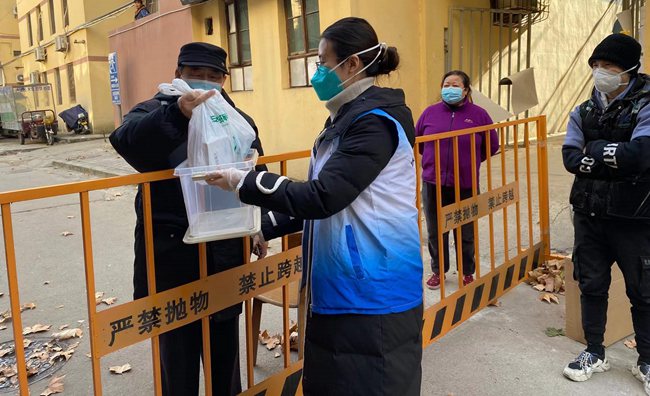 志愿者將藥品送到患者小區(qū)門(mén)口。陜西省第二人民醫(yī)院供圖