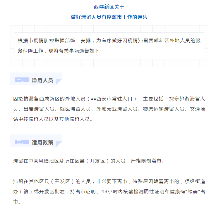 西咸新區(qū)發(fā)布關(guān)于做好滯留人員有序離市工作的通告。