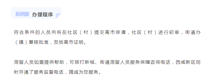 符合條件的人員向所在社區(qū)(村)提交離市申請(qǐng),社區(qū)(村)進(jìn)行初審,街道辦(鎮(zhèn))復(fù)核批準(zhǔn),發(fā)放離市證明。