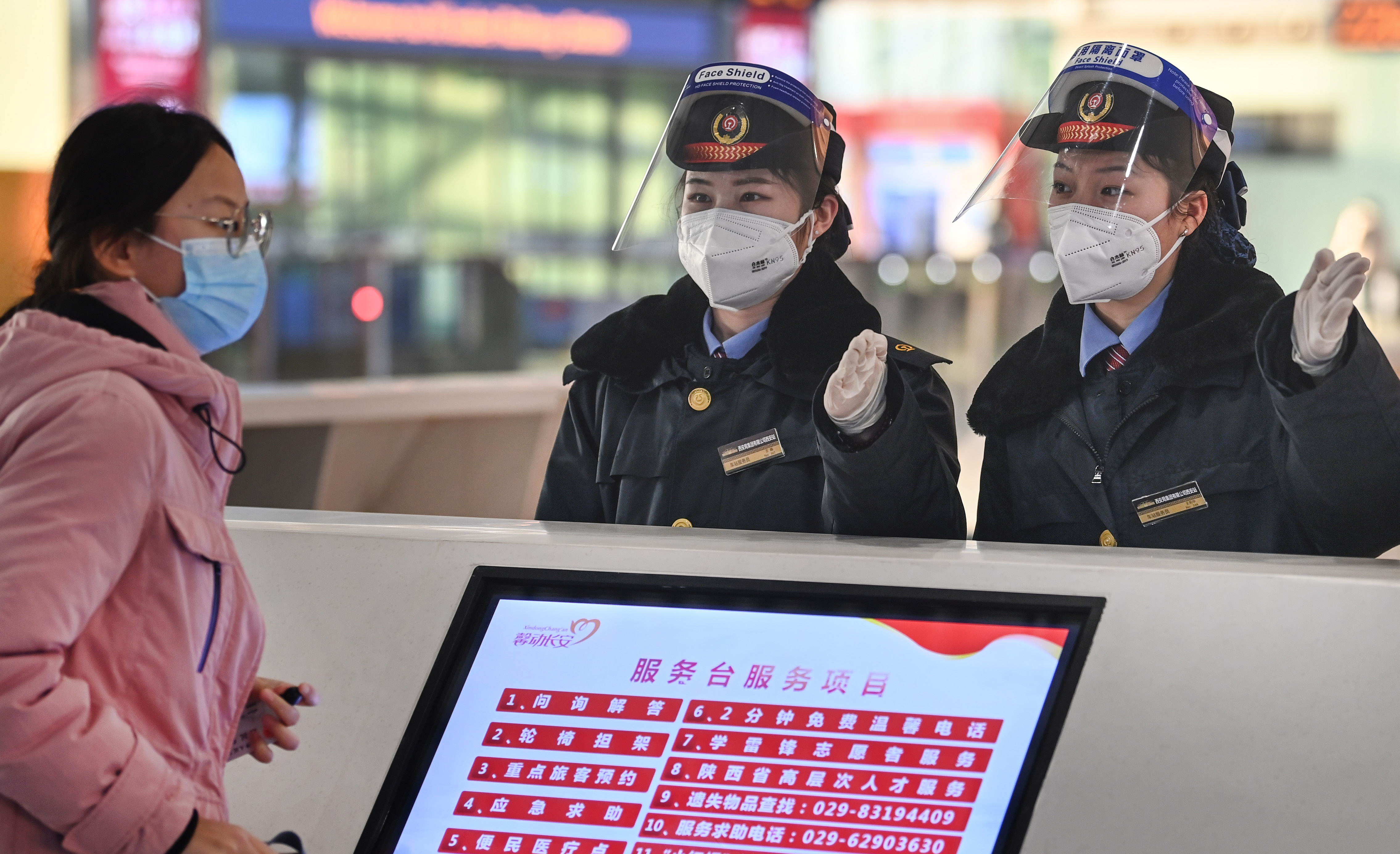 1月16日,西安北站服務臺客運員(右一二)在解答旅客問題。