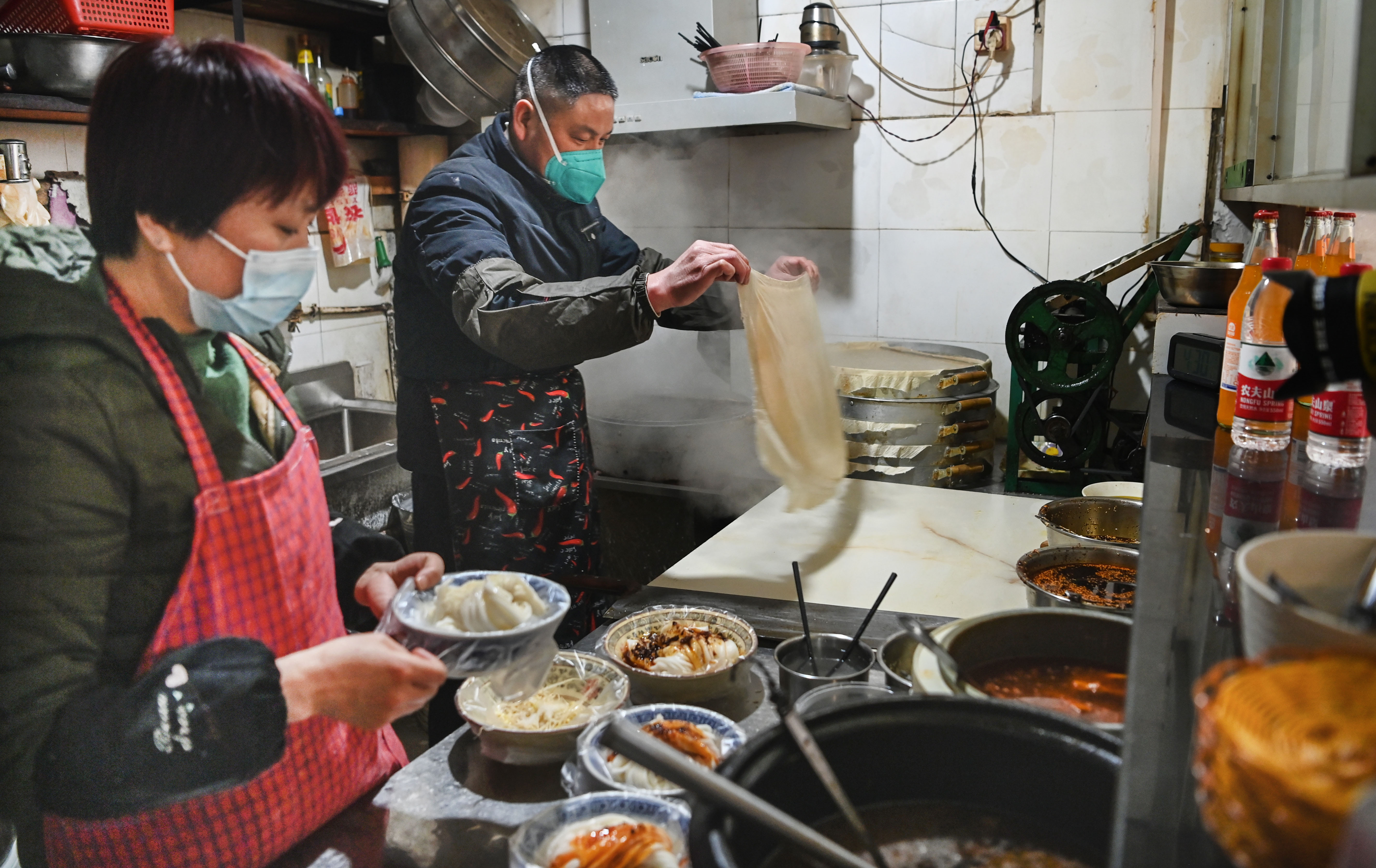 1月17日,西安市未央?yún)^(qū)一家小吃店開(kāi)始營(yíng)業(yè),為附近居民送餐上門。新華社記者 陶明 攝