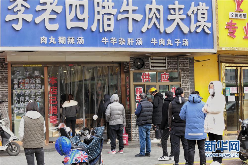 1月20日,西安市經(jīng)開區(qū)街頭,市民在餐飲店前排隊采購食品。新華網(wǎng) 王智超攝