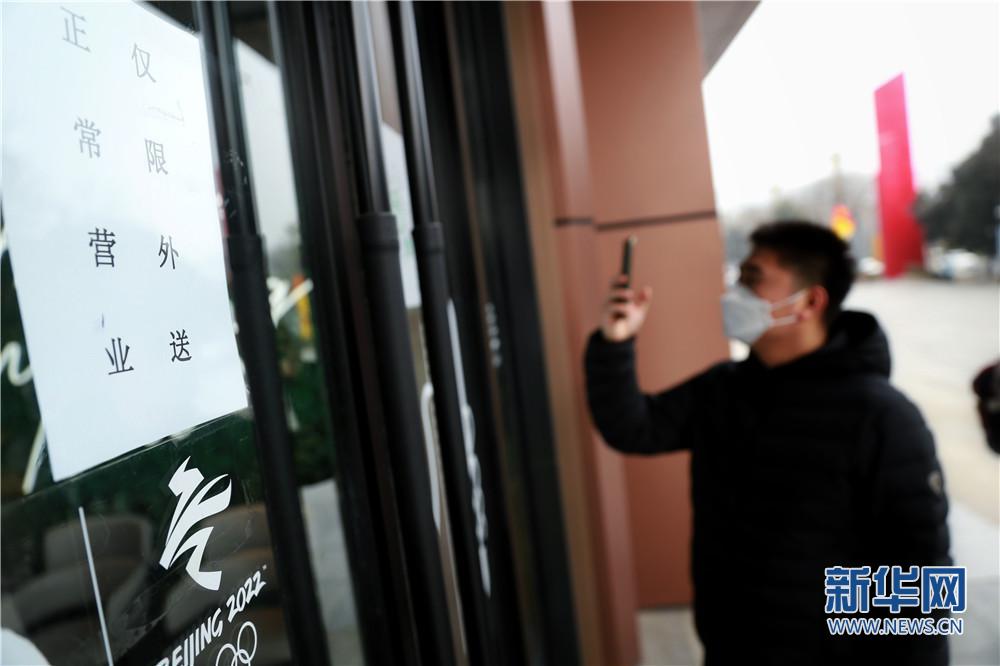 1月20日,西安市經(jīng)開區(qū)街頭,市民在餐飲店前掃碼準備領取打包食品。新華網(wǎng) 王智超攝