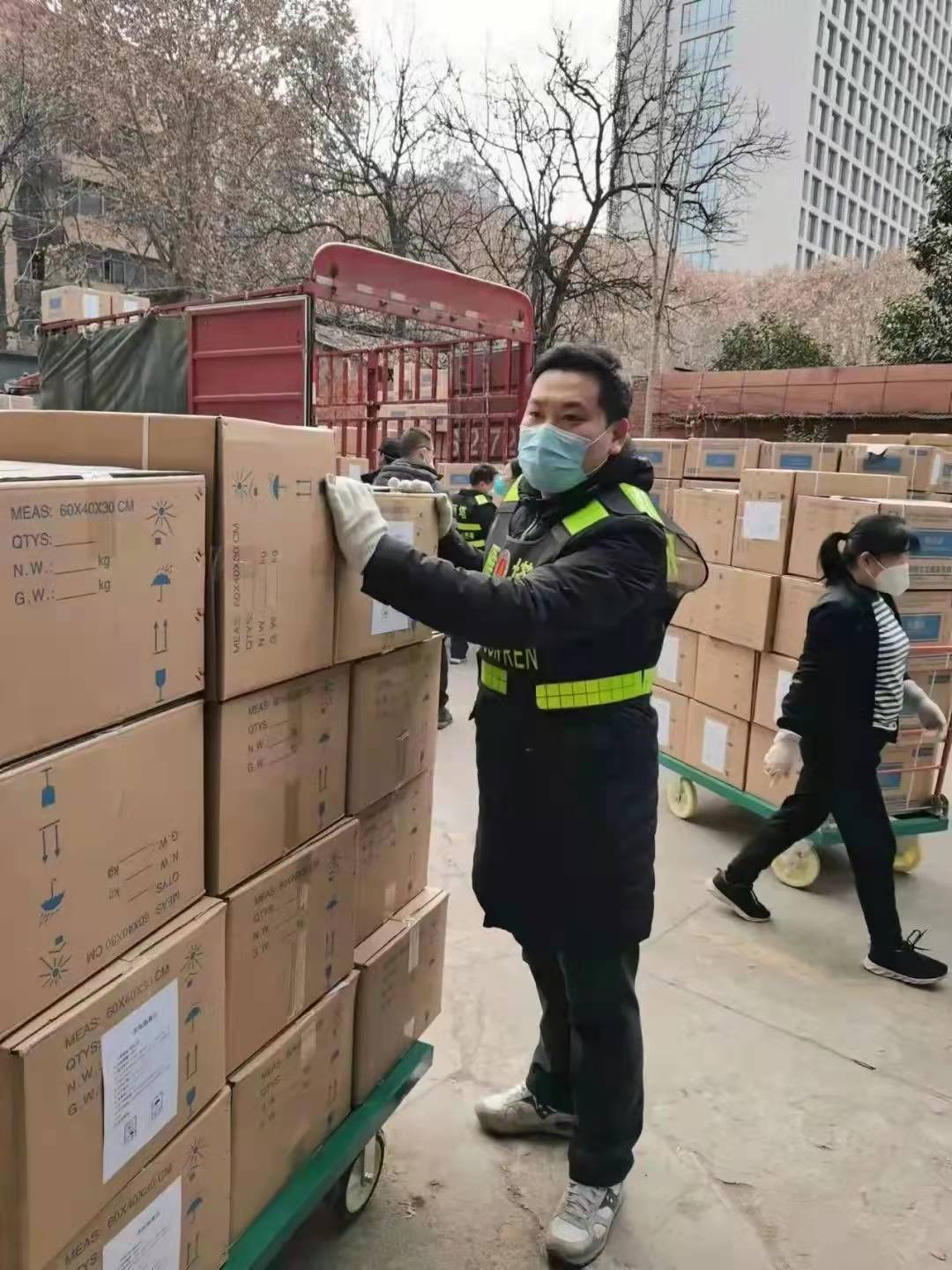 在雁塔區(qū)防疫物資保障中心,耿毅和18名志愿突擊隊隊員共同負責搬運物資工作。搬運是個力氣活,每天從四面八方匯集而來的物資更是源源不斷。只要有物資運來,他們便立即進入戰(zhàn)斗狀態(tài),爬上一輛輛大卡車,將物資一箱箱從車上卸下來,分門別類整理好,再搬到指定庫房或區(qū)域。由于各類物資抵達的時間不固定,耿毅他們幾乎是全天候待命。天氣雖然寒冷,但一天工作下來,志愿者們卻忙得直冒汗。