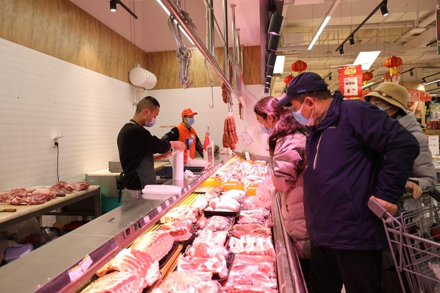 在蔬菜區(qū)、水產區(qū)、肉類區(qū),工作人員稱重、打包,忙得不亦樂乎。“今天一大早就有不少群眾來,各種肉類和火鍋食材賣得很快,還有顧客一次性買了800多元的肉卷。大家都說要多買點菜,好好吃頓火鍋。我們工作人員現場切肉、殺魚,也是忙得不可開交。”該超市一汪姓負責人表示,從上午的情況看,群眾購買商品的意愿都很強,大家對各類商品的需求都很大。
