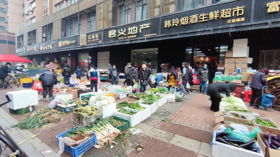 走出超市,漫步街邊,沿街陸續(xù)開業(yè)的小商鋪,同樣展現著這個城市久違的活力。在楓葉廣場2期小區(qū)西南門,正在營業(yè)的蔬菜店、水果店生意很是不錯,新鮮的茄子、青筍、白菜用紙箱裝著,被整整齊齊地擺在沿街人行道上,不少市民正在選購心儀的菜品。