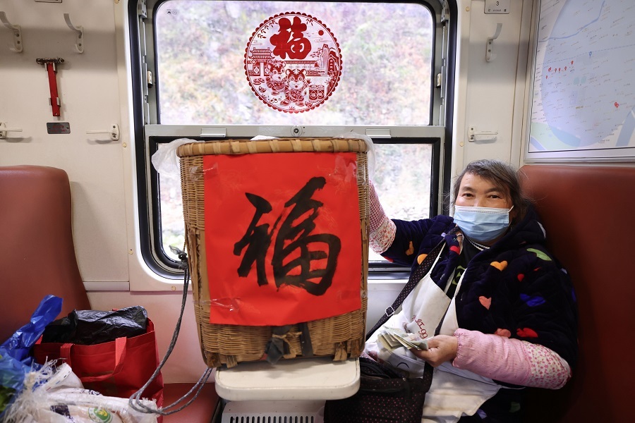 “各位老鄉(xiāng),早上好,今天是農(nóng)歷小年,我們將舉行送祝?;顒?。”列車員衛(wèi)進忠的話音剛落,就看見車廂里老鄉(xiāng)們急忙圍攏過來。他把寫好的春聯(lián)送給身邊背著背簍的一位老人,將一張福字貼在了背簍上。拿到對聯(lián)、福字的老人滿臉笑容,連忙道謝。“火車快開, 別讓我等待,火車快開,請你趕快送我到遠方家鄉(xiāng)……”在與旅客互動中,列車員李愛民激情演唱歌曲《火車快開》,送去列車工作人員的新春祝福,引來旅客們陣陣掌聲。