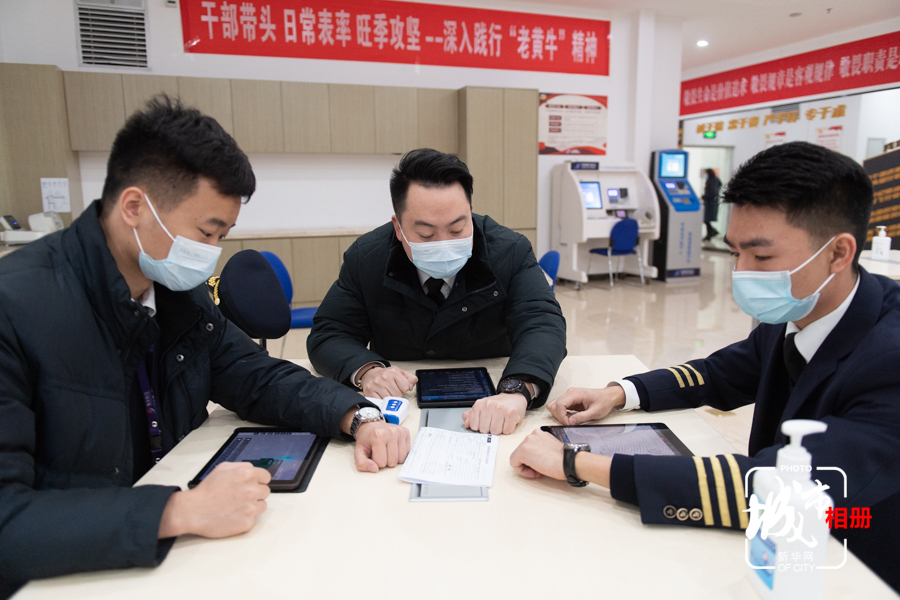 今年是劉曉周第一次參與春運。每一次出發(fā)前,劉曉周都要學習最新的個人防護知識和旅客疫情應(yīng)急處置流程,同時還要充分了解航班始發(fā)地、經(jīng)停地、目的地機場防疫要求。新華網(wǎng) 耿駿宇 攝 陳雨 文