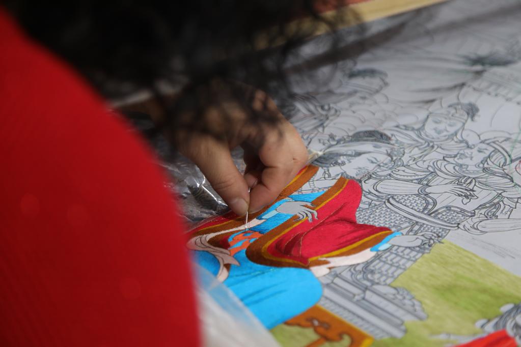 1月24日,繡娘石玉秀在制作藏繡作品《格薩爾王》。新華社記者趙玉和 攝