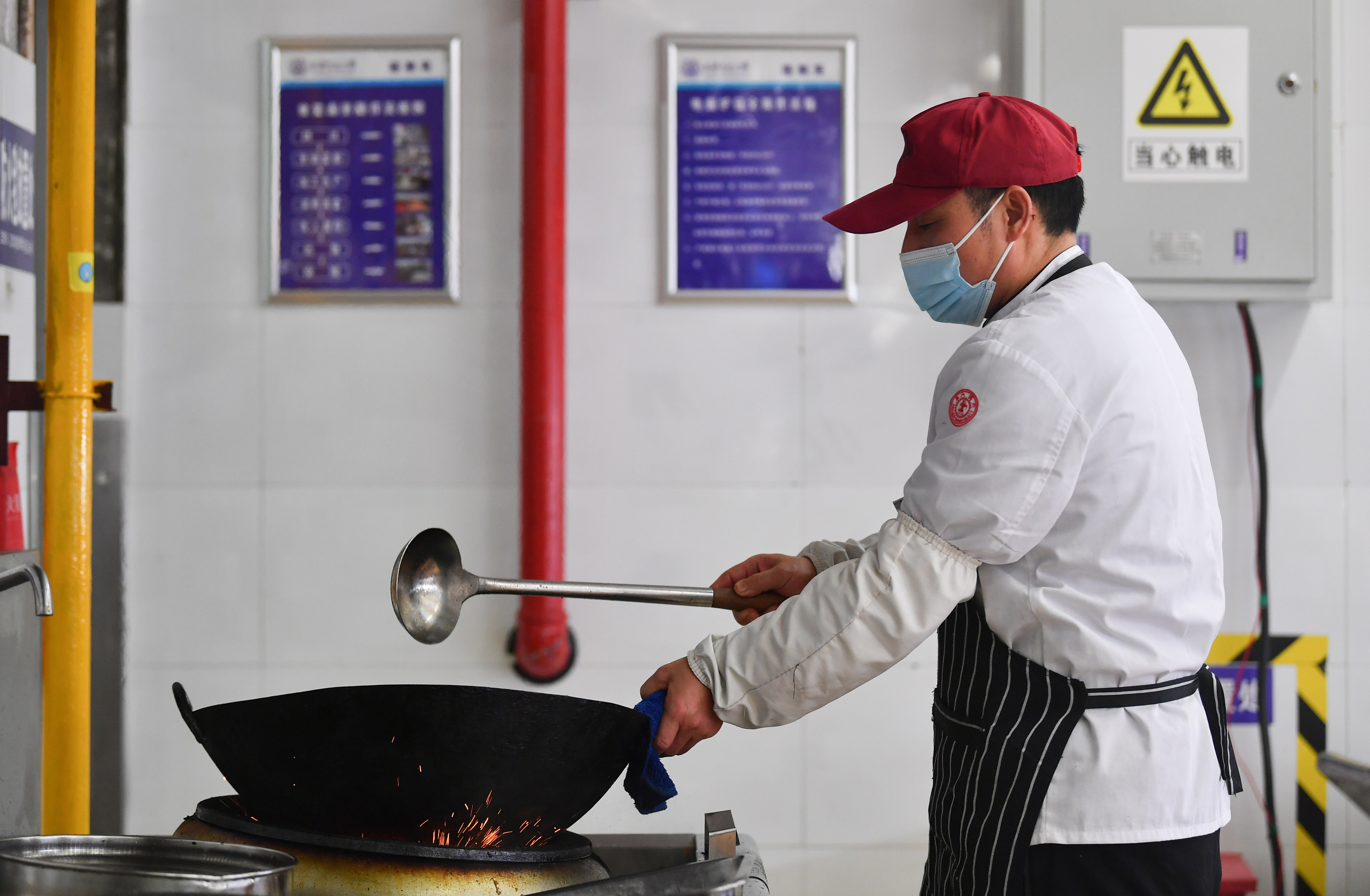 1月29日,工作人員在西安交通大學(xué)興慶校區(qū)校園食堂準(zhǔn)備午餐。新華社記者 張博文 攝