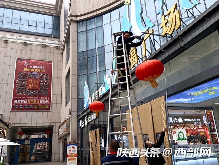 在鄠邑區(qū)海福廣場,工作人員掛起大燈籠