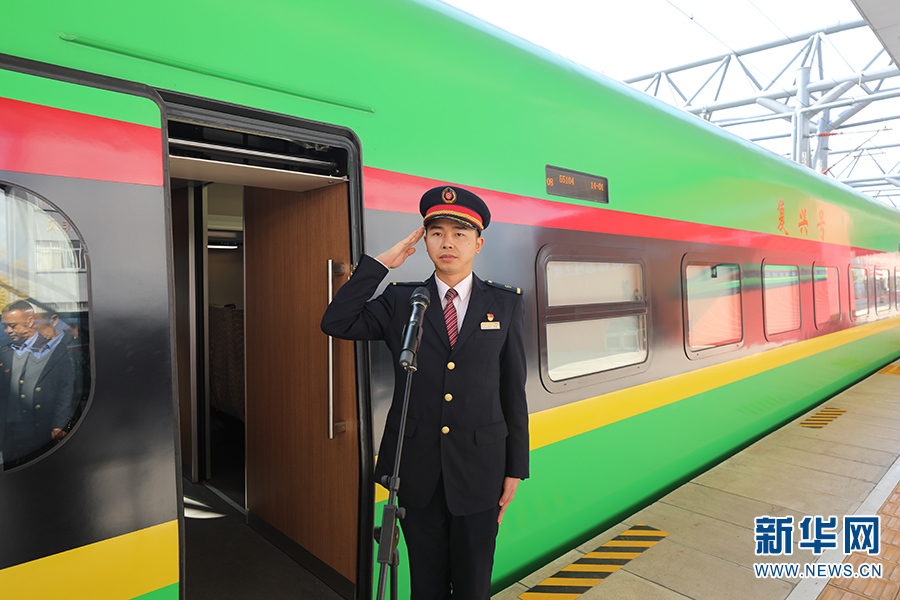 2021年12月3日,中老鐵路正式通車,開辟了中國國際鐵路運輸新紀(jì)元,那一天,胡堅站在站臺上,代表中國鐵路火車司機請示發(fā)車。(新華網(wǎng) 范芳鈺/文 昆明機務(wù)段供圖)