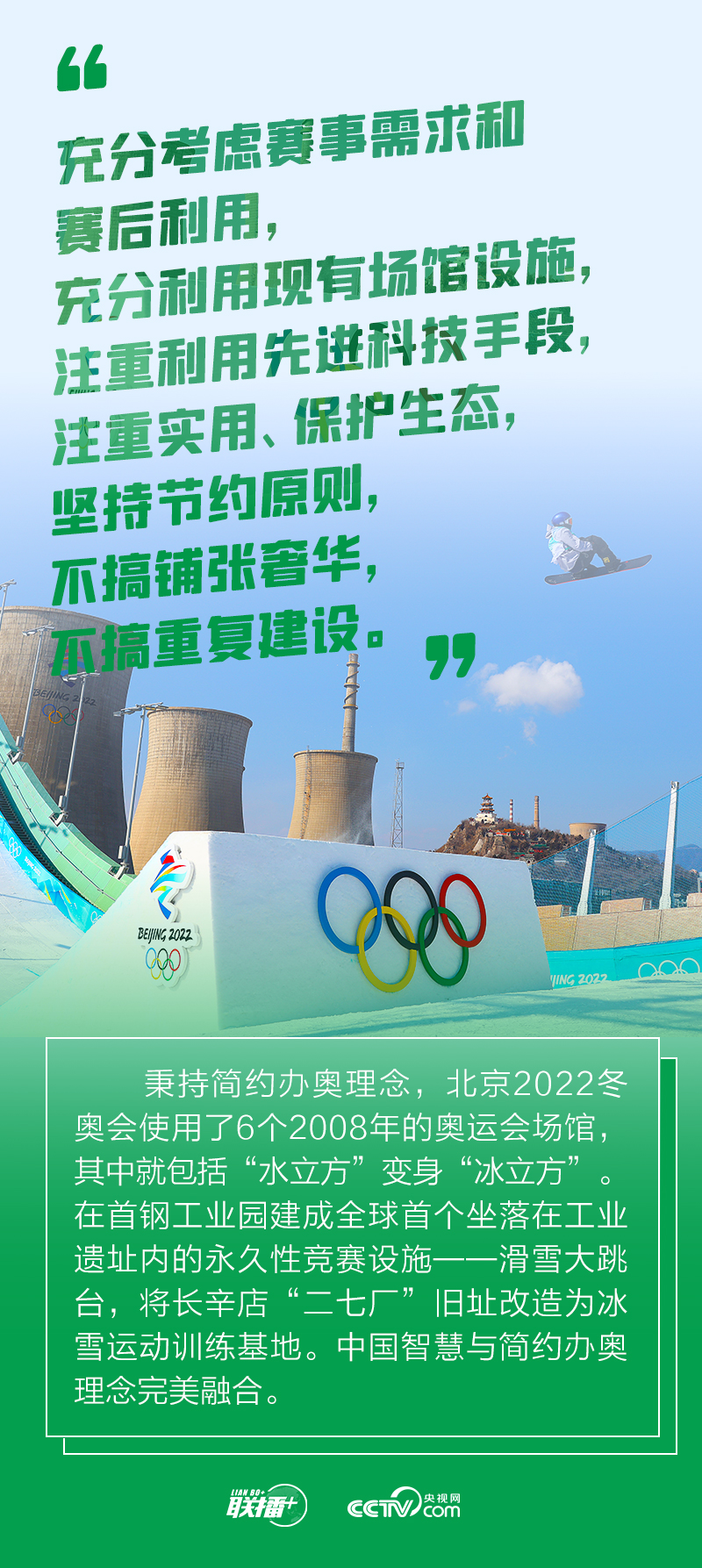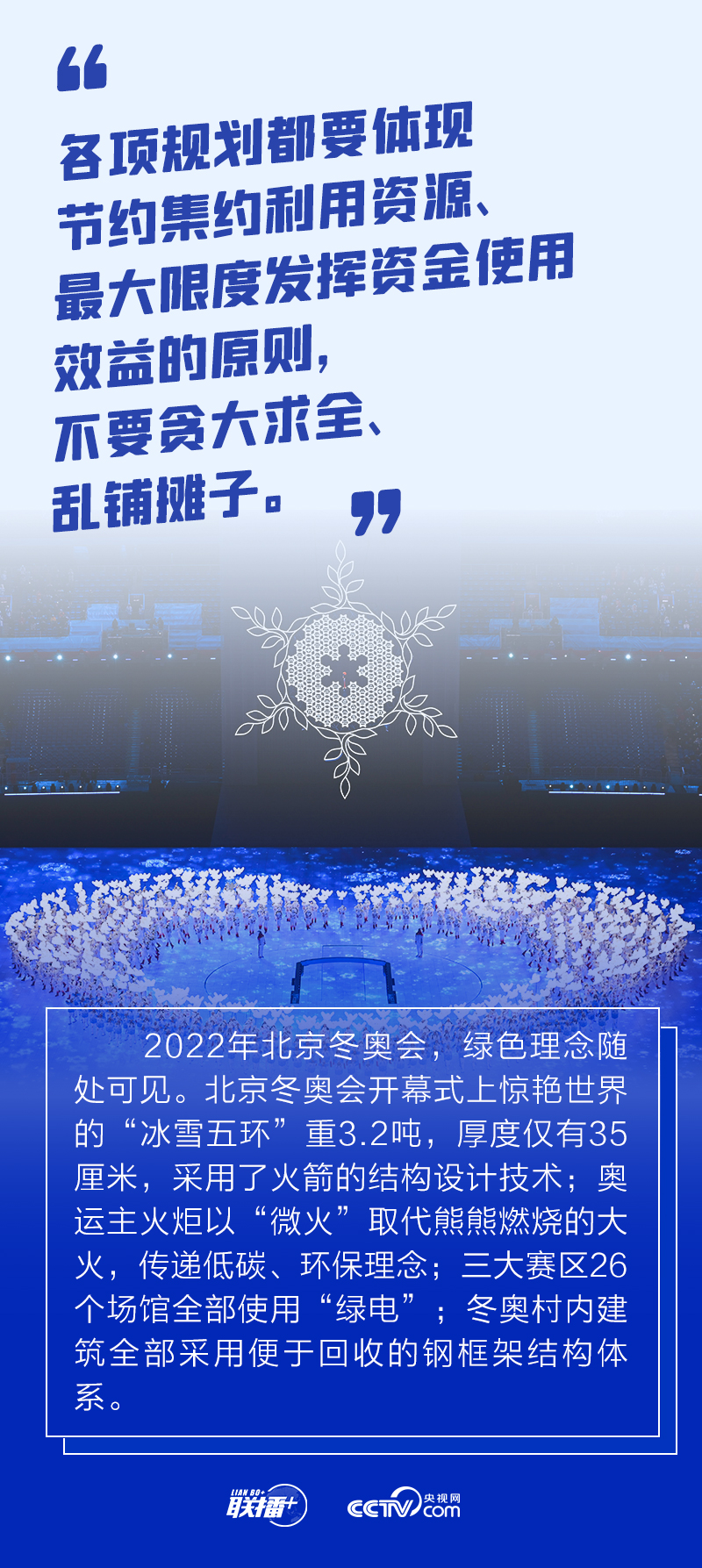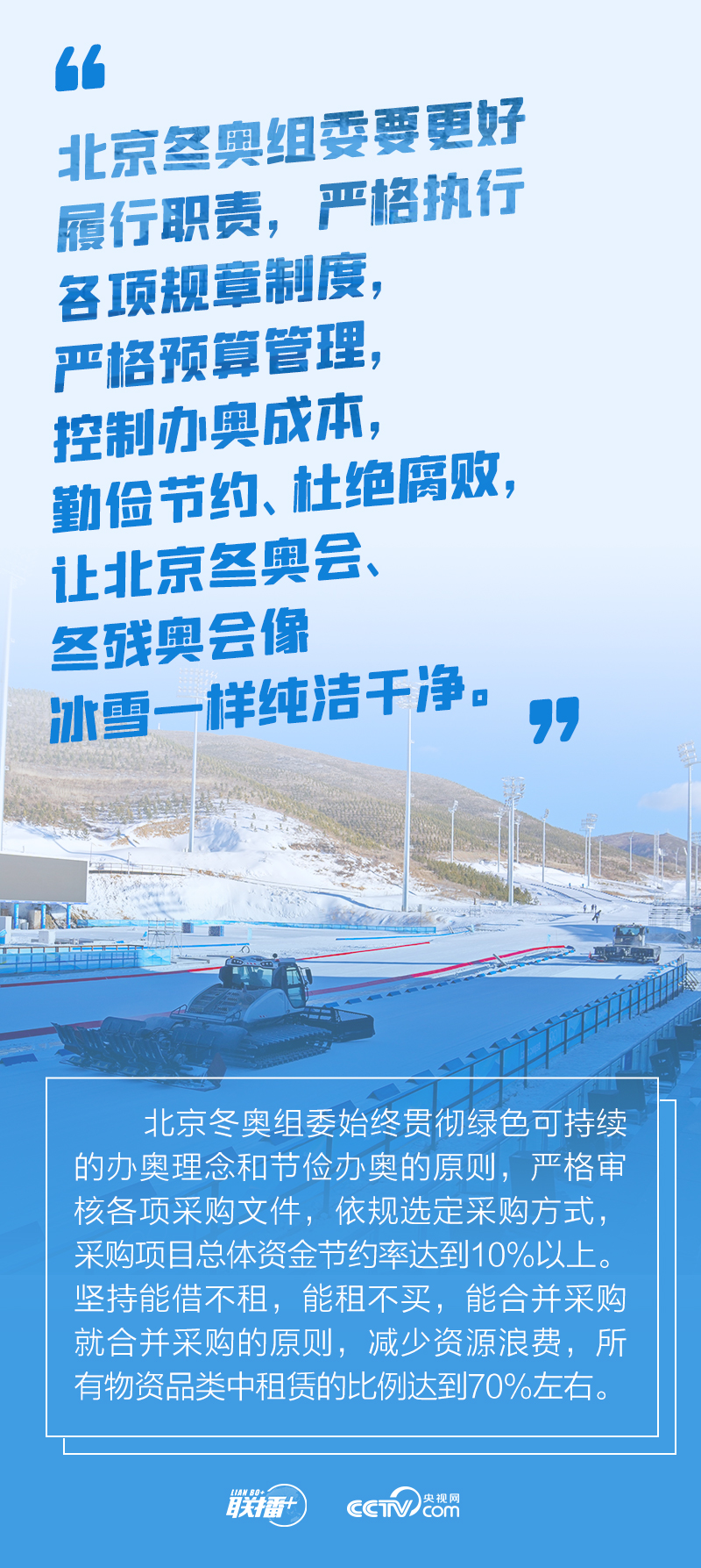 冬奧會籌辦過程中,總書記始終嚴(yán)格要求把勤儉節(jié)約作為“廉潔辦奧”的重要內(nèi)容。2021年1月20日召開的會議進(jìn)一步提出要做好簡化辦賽工作,從實(shí)際出發(fā),精簡非必要環(huán)節(jié)、活動和人員數(shù)量。