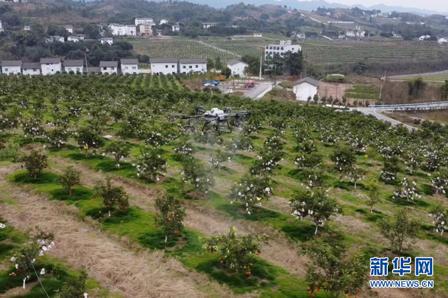 一架植保無(wú)人機(jī)正在渝北區(qū)大盛鎮(zhèn)青龍村的果園內(nèi)噴灑營(yíng)養(yǎng)液。新華網(wǎng) 耿駿宇 攝