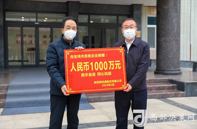 西部決策網(wǎng)訊(韓宗憲 通訊員 羅金)3月18日,陜西西鳳酒股份有限公司向?qū)氹u市慈善總會(huì)捐贈(zèng)1000萬(wàn)元,支持全市抗疫工作。寶雞市慈善總會(huì)常務(wù)副會(huì)長(zhǎng)牟林樂(lè),西鳳集團(tuán)公司黨委書(shū)記、董事長(zhǎng)、股份公司董事長(zhǎng)張正以及公司班子成員、部分職工代表參加了捐贈(zèng)儀式。寶雞市慈善總會(huì)副會(huì)長(zhǎng)兼秘書(shū)長(zhǎng)李海珠主持儀式。