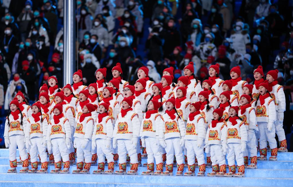 2月4日晚,第二十四屆冬季奧林匹克運(yùn)動(dòng)會(huì)開幕式在北京國(guó)家體育場(chǎng)舉行。這是“馬蘭花兒童合唱團(tuán)”用希臘語(yǔ)在開幕式上歌唱。新華社記者曹燦攝