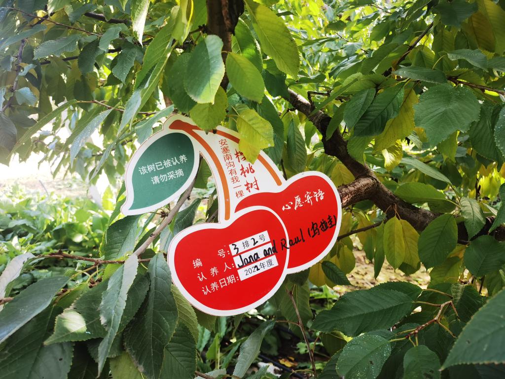 延安市安塞區(qū)高橋鎮(zhèn)南溝村的櫻桃園里,被國(guó)外消費(fèi)者認(rèn)養(yǎng)的櫻桃樹(shù)。受訪(fǎng)者供圖