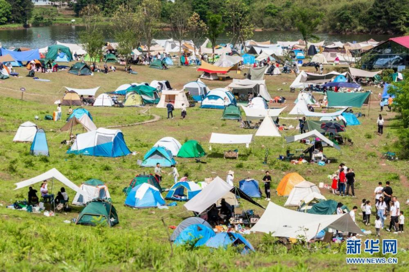 5月3日,人們在重慶市南川區(qū)黎香湖國家濕地公園露營基地搭帳篷游玩。新華社發(fā)(瞿明斌攝)
