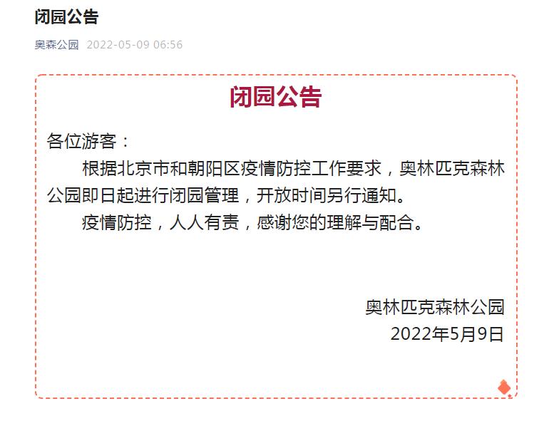 “奧森公園”微信公眾號(hào)9日發(fā)布閉園公告,根據(jù)北京市和朝陽(yáng)區(qū)疫情防控工作要求,奧林匹克森林公園即日起進(jìn)行閉園管理,開放時(shí)間另行通知。