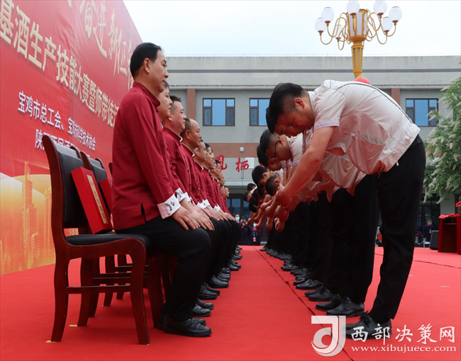 大賽儀式上,西鳳集團(tuán)舉行了2022年師帶徒活動拜師儀式,32名新老基酒一線職工結(jié)成16對“師徒”對子。以徒弟敬“連心酒”,師傅贈送《西鳳酒文化瑰寶》,師徒共誦《弟子表》的形式完成了拜師禮,正式結(jié)為師徒。在今后的工作中這些師徒將共同奮戰(zhàn)在生產(chǎn)一線,師帶徒、徒幫師,將古老的制曲制酒工藝代代傳承。