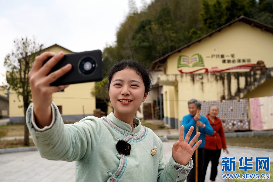 在江西省永豐縣三坊鄉(xiāng)下坊村,王玉萍正在拍攝制作短視頻。新華網(wǎng) 發(fā)