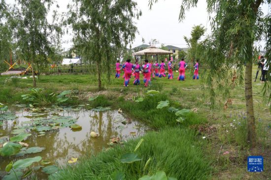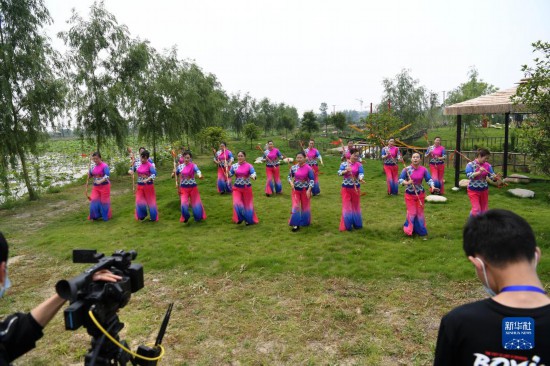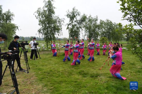 5月15日,肥西縣柿樹崗鄉(xiāng)村民通過“云上”直播表演當地傳統(tǒng)非遺文化項目蓮湘舞。新華社記者劉軍喜攝
