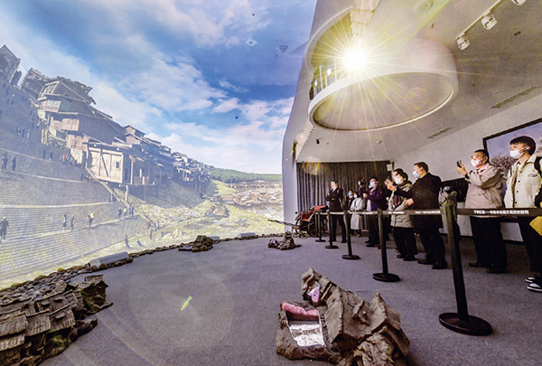 圖為在重慶紅巖革命紀念館“紅巖記憶”數(shù)字體驗廳內(nèi),觀眾們觀看以雙曲三維穹幕技術展示的場景。 新華社記者 李賀/攝