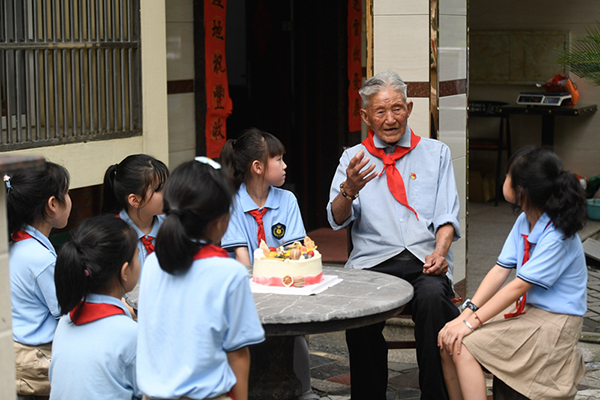 2020年6月28日,浙江省湖州市吳興區(qū)八里店鎮(zhèn)組織小學生開展“童心向黨”主題繪畫、聆聽老黨員講故事、參觀紅色教育基地等活動。圖為吳興區(qū)第一小學學生聆聽八里店鎮(zhèn)前村村老黨員陳金茂(右二)講故事。新華社記者 黃宗治/攝