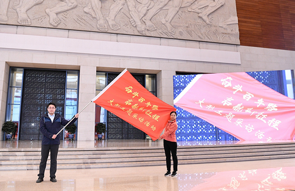 2021年1月18日,在北京國家博物館,記者代表展示“奮斗百年路 啟航新征程”大型主題采訪活動旗幟。新華社記者 申宏/攝