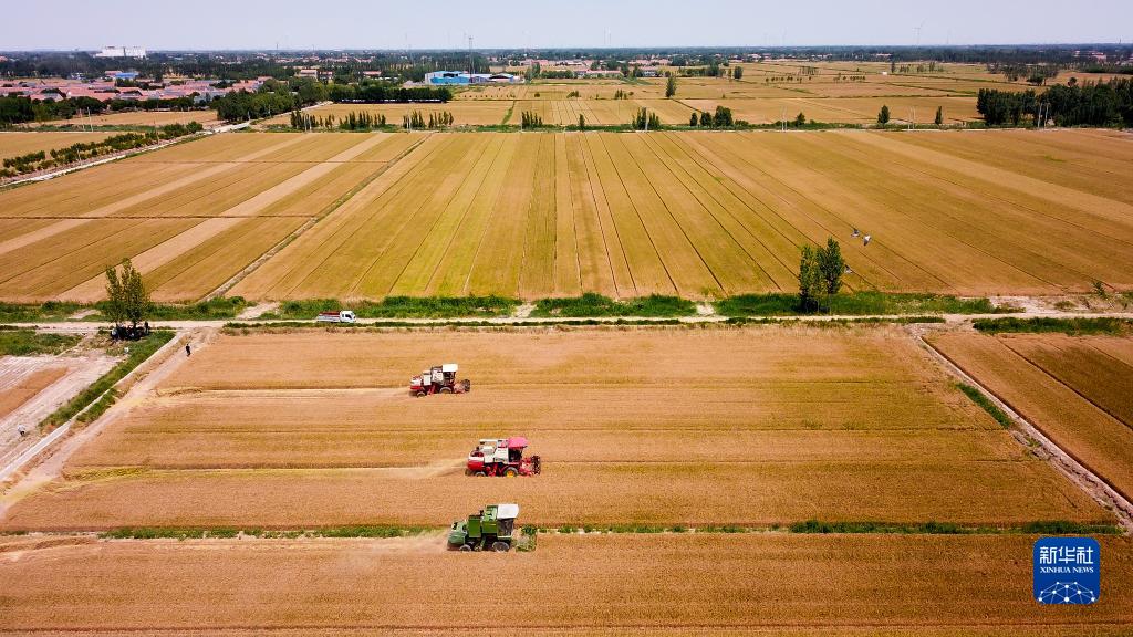 6月7日,在山東省惠民縣桑落墅鎮(zhèn),農(nóng)民駕駛農(nóng)機收獲小麥(無人機照片)。新華社記者 郭緒雷 攝