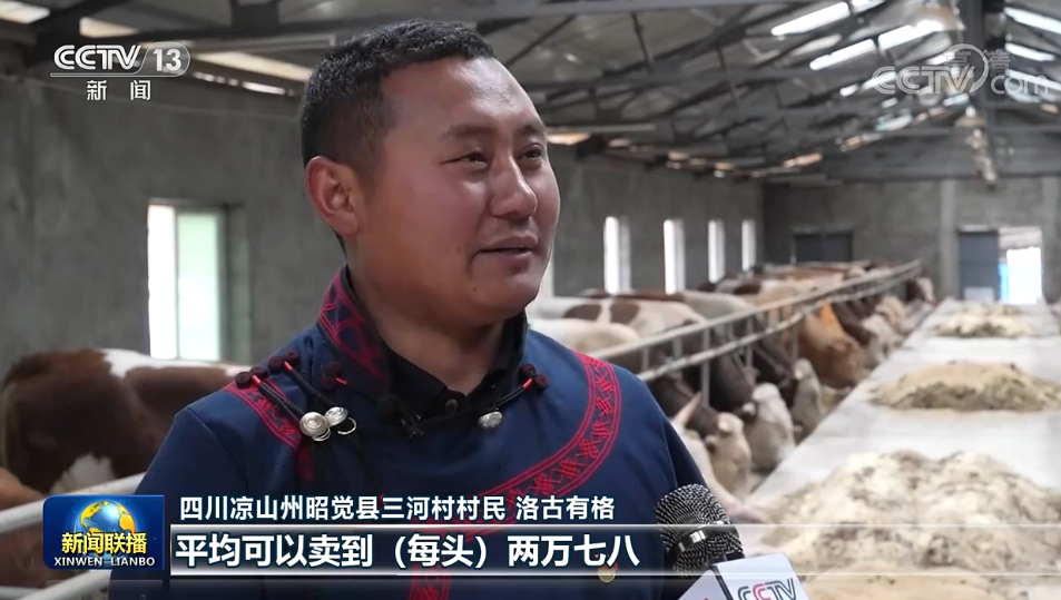 四川涼山州昭覺縣三河村村民 洛古有格:當時總書記來的時候,我們這個養(yǎng)牛只有十幾頭。通過發(fā)展,我們?nèi)哟逵辛?000多頭這個西門塔爾?!,F(xiàn)在我們這個牛,平均可以賣到(每頭)兩萬七八,大的可以賣到三萬多元,效益特別好。