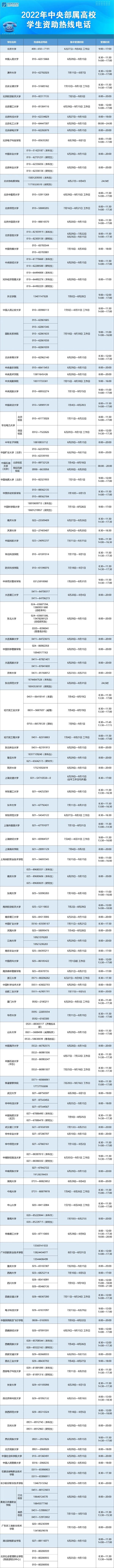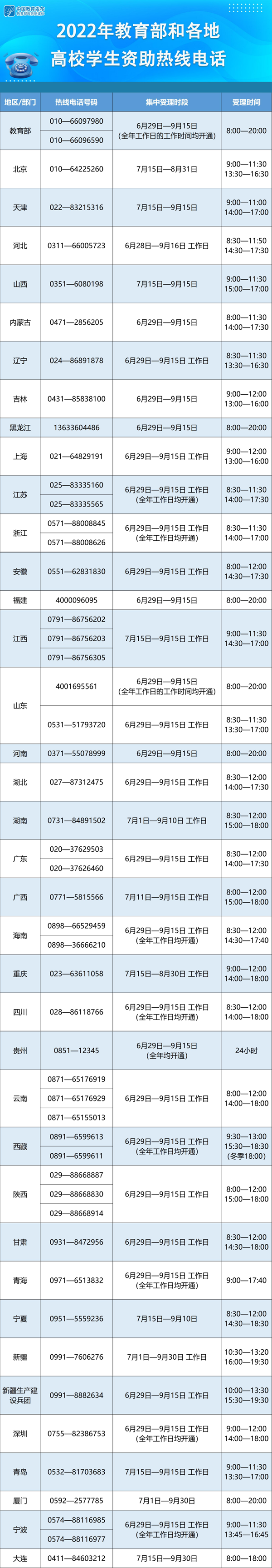 教育部要求各?。▍^(qū)、市)及所屬高校、中央高校學(xué)生資助管理部門均開通熱線電話,并結(jié)合實際情況自行確定集中受理時段和具體受理時間。