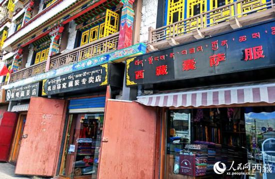 環(huán)繞拉薩八廓古城,開滿了藏裝店。人民網 李海霞攝
