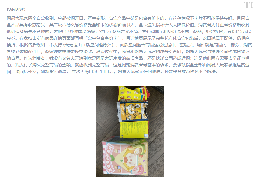 今年5月,在人民網(wǎng)“人民投訴”平臺(tái)上,一位網(wǎng)友“吐槽”了自己購買盲盒時(shí)遇到的“糟心事”,其表示自己在某平臺(tái)購買了盲盒玩具,收到時(shí)卻發(fā)現(xiàn)商品破損,但商家不同意更換,并故意拖延不予解決。