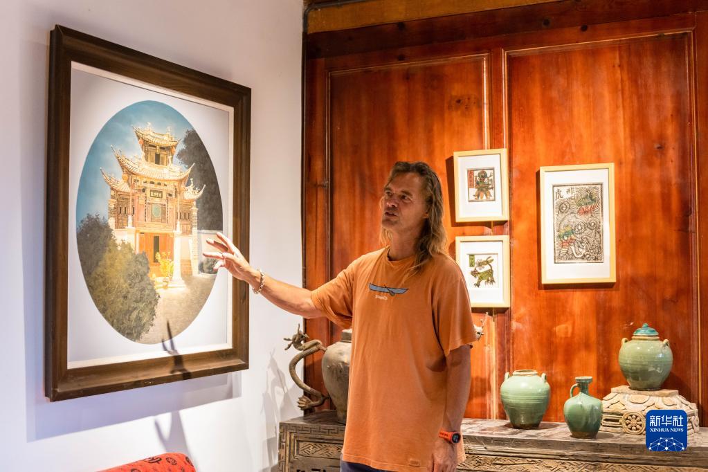 8月27日,林登在喜洲古鎮(zhèn)喜林苑向外國(guó)訪客介紹當(dāng)?shù)匚幕?。新華社記者 曹夢(mèng)瑤 攝