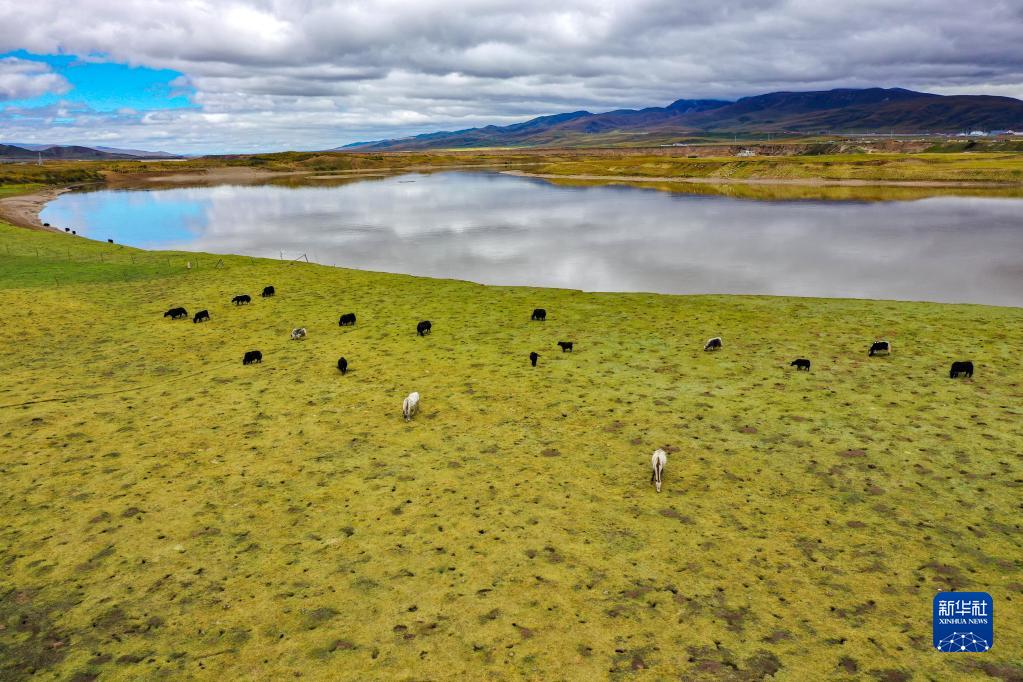 牛群和馬在黃河瑪曲段干流沿岸的一處草地上吃草(9月17日攝,無人機(jī)照片)?,斍h在2019年就實現(xiàn)了草畜平衡。新華社記者 郎兵兵 攝
