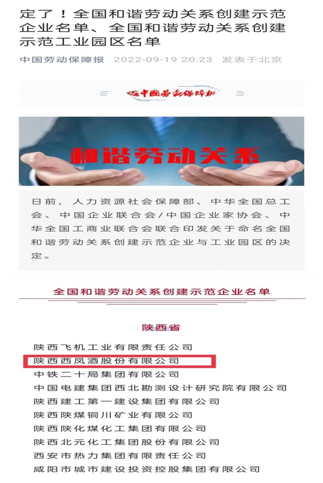 西部決策網(wǎng)訊(記者艾米杰 韓宗憲 通訊員 許凡 張?zhí)炝ⅲ闃淞⑹痉兜湫?、弘揚(yáng)人文關(guān)懷、傳遞和諧溫暖,進(jìn)一步推動廣大企業(yè)深入開展和諧勞動關(guān)系創(chuàng)建活動,促進(jìn)構(gòu)建中國特色和諧勞動關(guān)系。近日,人力資源和社會保障部、中華全國總工會、中國企業(yè)聯(lián)合會/中國企業(yè)家協(xié)會、中華全國工商業(yè)聯(lián)合會聯(lián)合印發(fā)《關(guān)于命名全國和諧勞動關(guān)系創(chuàng)建示范企業(yè)與工業(yè)園區(qū)的決定》,陜西西鳳酒股份有限公司榜上有名,榮獲“全國和諧勞動關(guān)系創(chuàng)建示范企業(yè)”稱號。