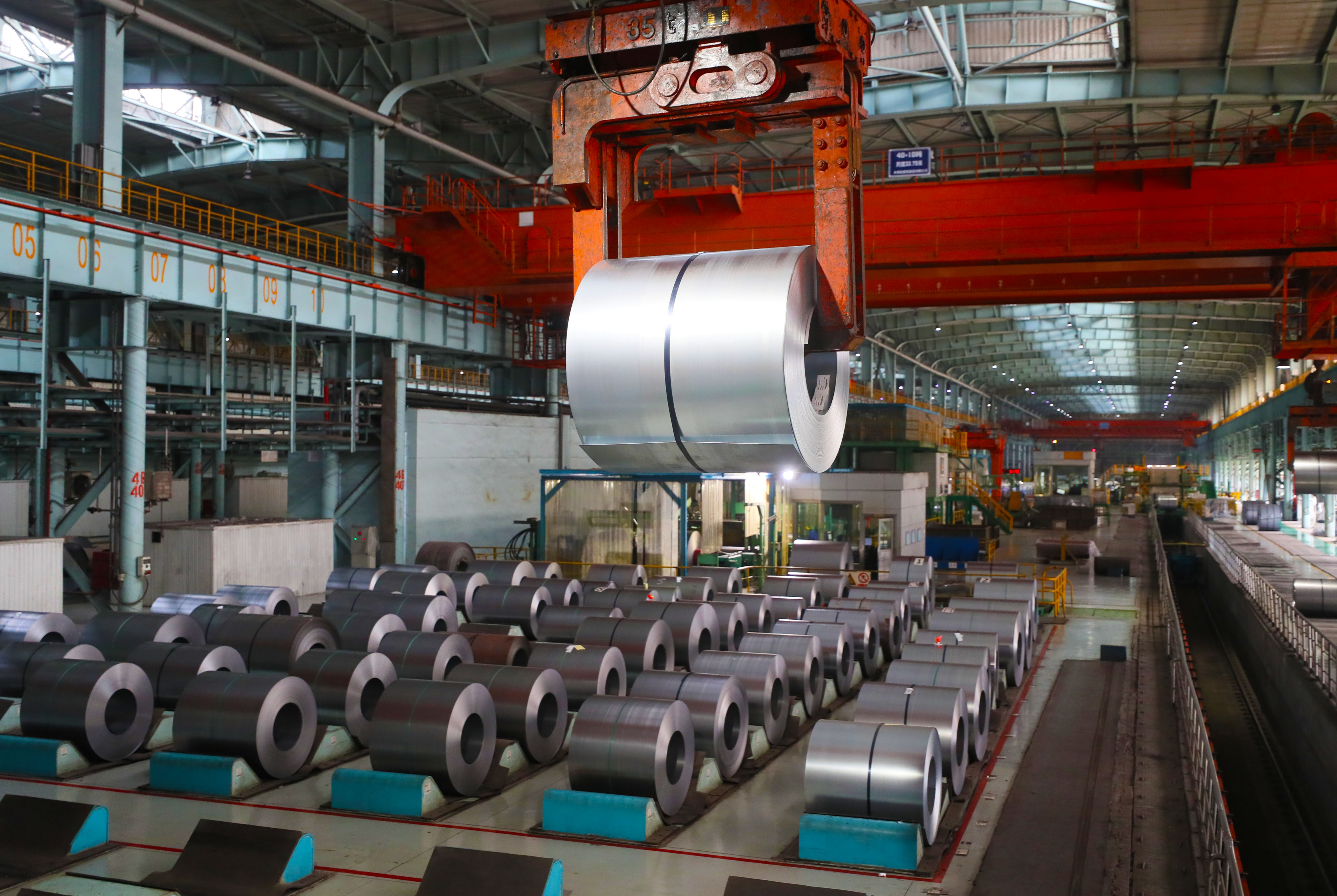 在遼寧本鋼冷軋廠(chǎng),吊車(chē)在吊裝鋼卷(2021年8月18日攝)。新華社記者 楊青 攝