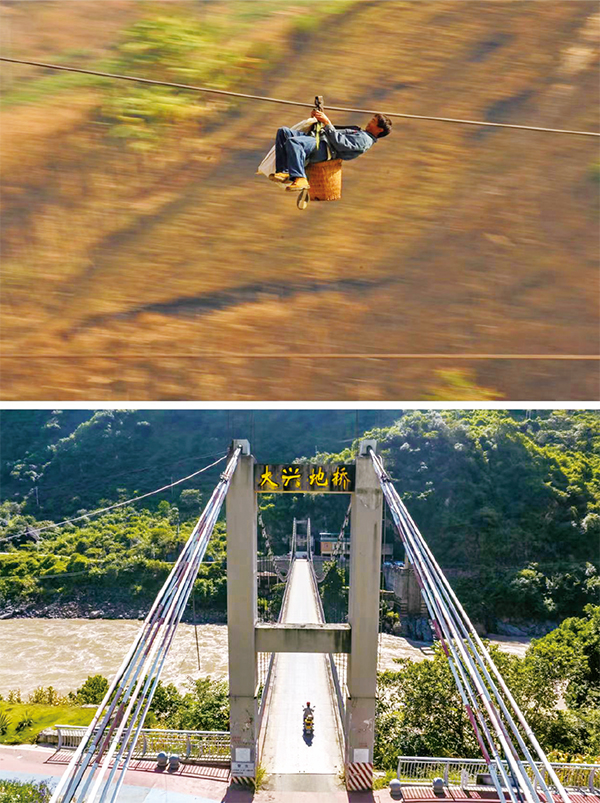 “過江靠溜索”曾是怒江兩岸群眾出行的重要方式。2013年,國家實(shí)施“溜索改橋”項(xiàng)目,幫助西部邊遠(yuǎn)山區(qū)群眾結(jié)束溜索時(shí)代,怒江州怒江段上溜索被改造為各式跨江橋梁,完成了沿江人民“天塹變通途”的企盼。上圖為2013年2月2日,在云南省怒江州瀘水市六庫街道,一名居民背著背簍溜索過江(新華社記者 王長山/攝)。下圖為2022年9月13日,瀘水市居民騎摩托車通過大興地橋(無人機(jī)照片,新華社記者 江文耀/攝)。