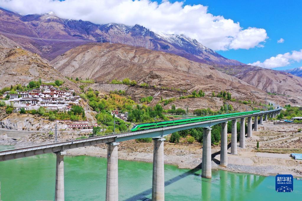 復(fù)興號(hào)列車(chē)行駛在西藏朗縣境內(nèi)(2022年4月14日攝)。新華社記者 覺(jué)果 攝