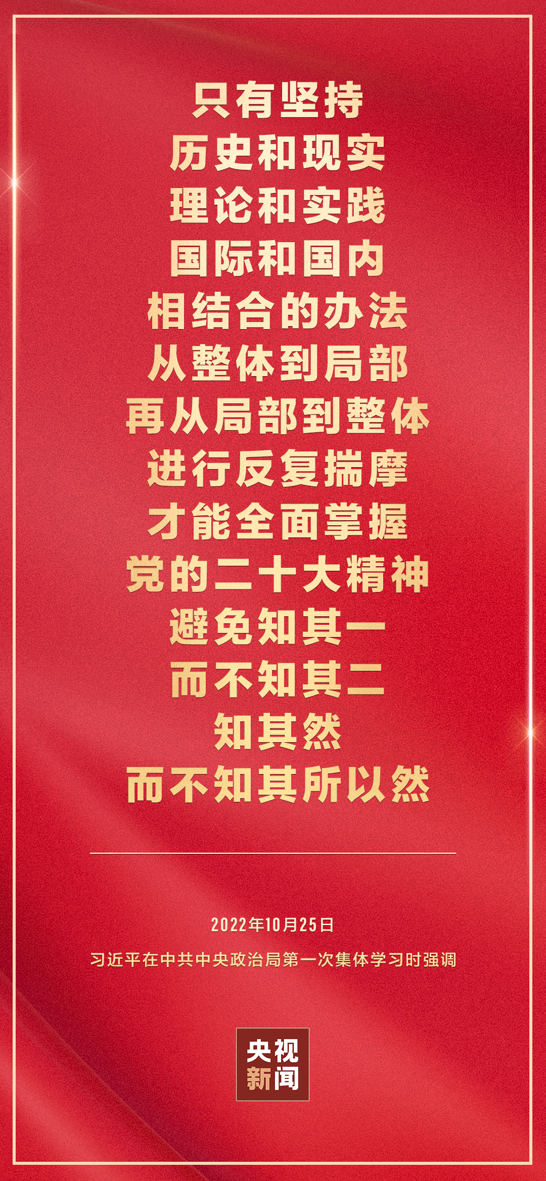 二十屆中共中央政治局10月25日下午就學習貫徹黨的二十大精神進行第一次集體學習。中共中央總書記習近平在主持學習時強調(diào),全黨要在全面學習、全面把握、全面落實上下功夫,堅定不移把黨的二十大提出的目標任務(wù)落到實處,奮力奪取全面建設(shè)社會主義現(xiàn)代化國家新勝利。
